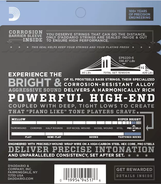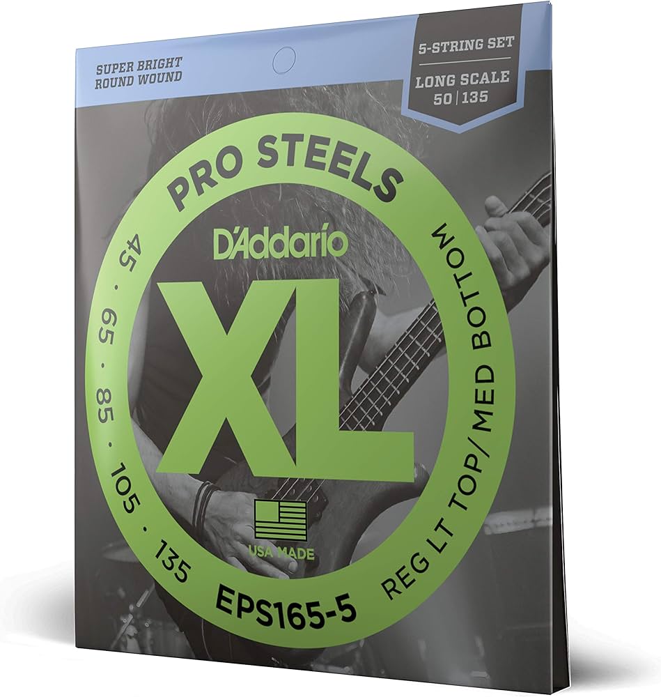 D’Addario EPS165 XL Pro Steels Bass Guitar Strings – .045-.135 Custom Light – 5-strings